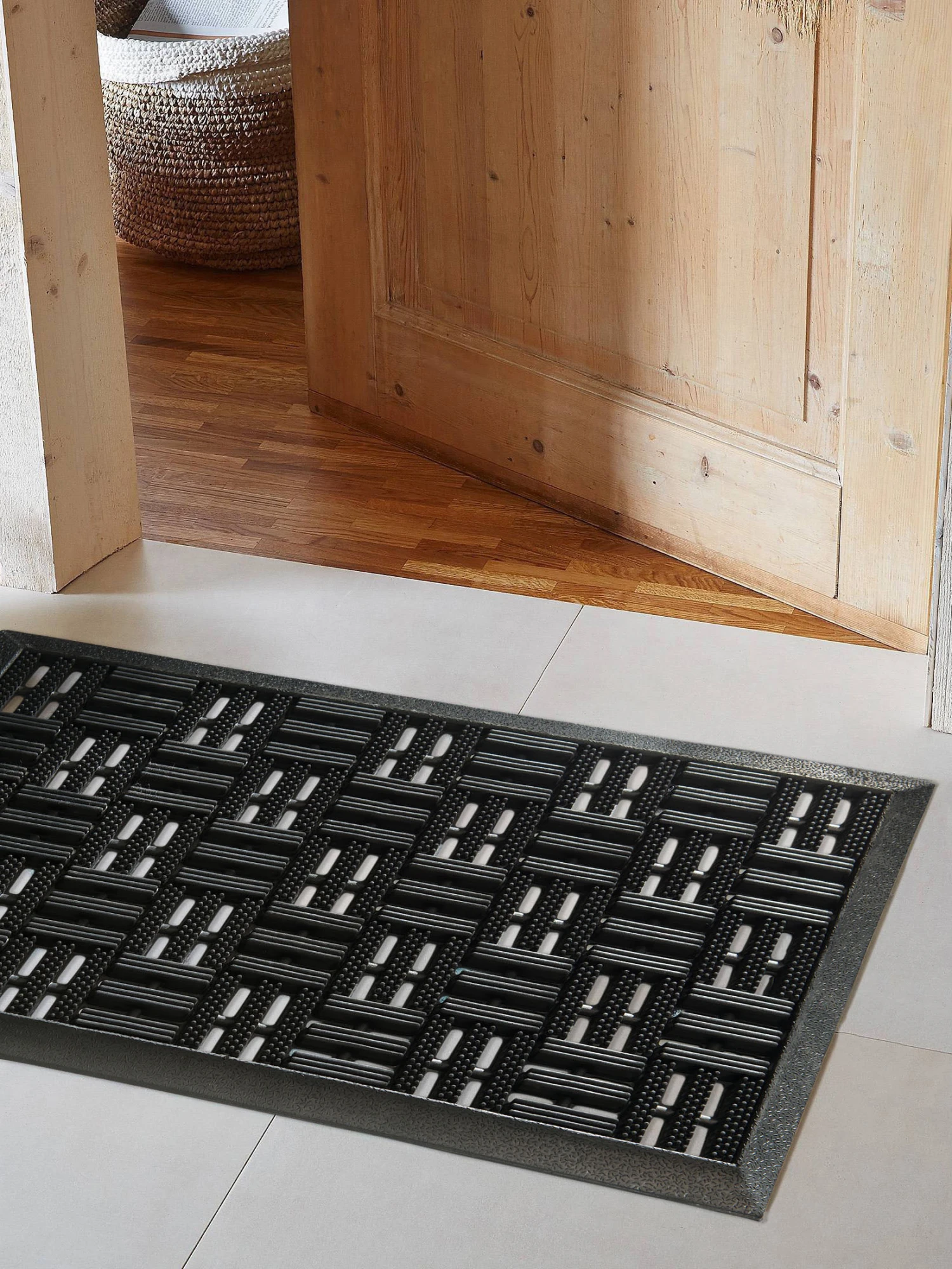 Sehr robuste Hartgummimatte mit Profilen, die tief in die Sohle greifen. Ideal für den Außenbereich – denn ob Schmutz oder Nässe – diese Matte nimmt beides gelassen.
